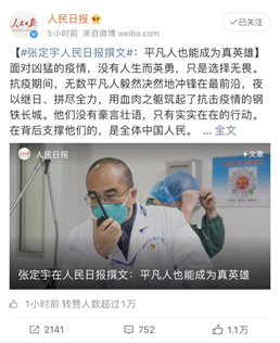 随后“张定宇人民日报撰文:平凡人也能成为真英雄”的消息迅速登上微博热搜榜榜首