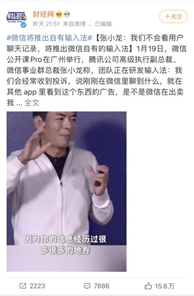 1月19日,财经网官方微博账号发布【张小龙:我们不会看用户聊天记录,将推出微信自有的输入法】话题文章。