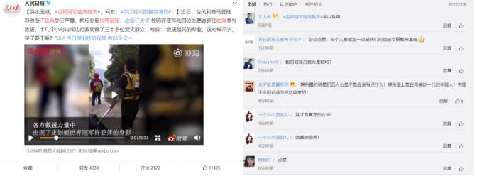 天灾的发生最考验的是人性,台风利奇马的预测登陆,国家防总及时部署防御工作,启动应急响应,一时间在影响范围的省份纷纷召开会议,启动防台风IV级应急响应,同时各级媒体及民众随时关注波及,在这个过程中也就发现很多有意义的“大事”,在狂风肆虐的雨天带来宁静及温暖。他们中有坚持记录台风现象吹到脸变形的知名主播,为了排涝长时间出警,饿到连吃11个包子的90后消防小哥,也有81岁高龄依然冒着风雨跪地观测的水文代办员,还有因清理垃圾被洪水冲走遇难的村干部及“学以致用”的世界冠军等都在为减少伤亡,降低损失拼搏着甚至献出生命,当然还有那些无名的,默默的英雄们用包容万物的爱,守护着一座座城市,一家家生活,一个个人, @央视新闻发起微博话题#致敬台风天的英雄们#,阅读1.7亿,讨论21.6万,就像网友们的态度:致敬英雄,愿你们每次负重都平安归来。